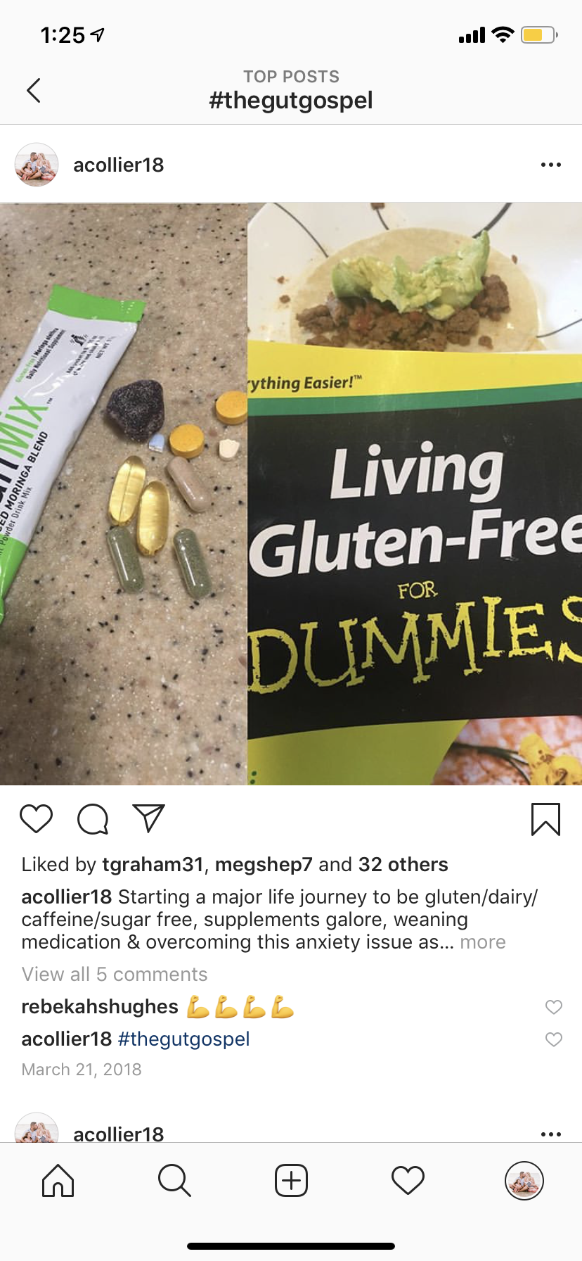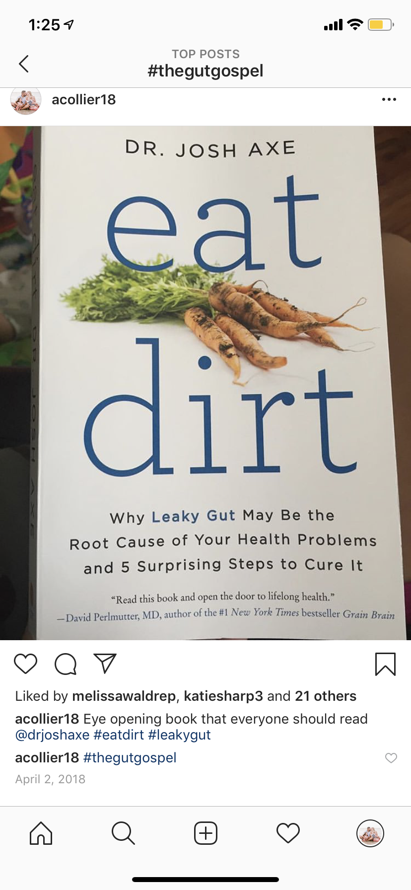 So, start with the gut type quiz and go from there. Read labels. Understand that you won’t starve! Focus on all the things you CAN eat, not what you can’t. Bring your own food or something to share to parties. Earth fare has amazing little GF/vegan cakes in their fridge section that are to die for. I would be happy to tell you any food options I can. I make a lot more from scratch now but when I first began it was to much. I plan to have more posts on my top ten go to’s for gut health, go to snacks, meals, cook books, people to follow on IG. The list goes on. But I have motherly duties calling so 2 posts in 2 days may be a miracle. My goal will be for weekly posts on the blog. I post on my instagram more frequently what I am eating or fitness activities. Follow the hashtag “the gut gospel” to make sure you don’t miss a post. But I am always a message away. In fact, if you take the gut type quiz, I would love to know what your result was. I had candida gut which was so obvious once I read about it. Dr. Axe’s book goes into detail of each type and gives specifics on foods, supplements, etc.