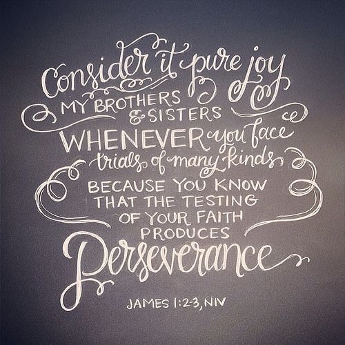 “Consider it pure joy, my brothers and sisters, whenever you face trials of many kinds, because you know that the testing of your faith produces perseverance. Let perseverance finish its work so that you may be mature and complete, not lacking anything. If any of you lacks wisdom, you should ask God, who gives generously to all without finding fault, and it will be given to you.”
